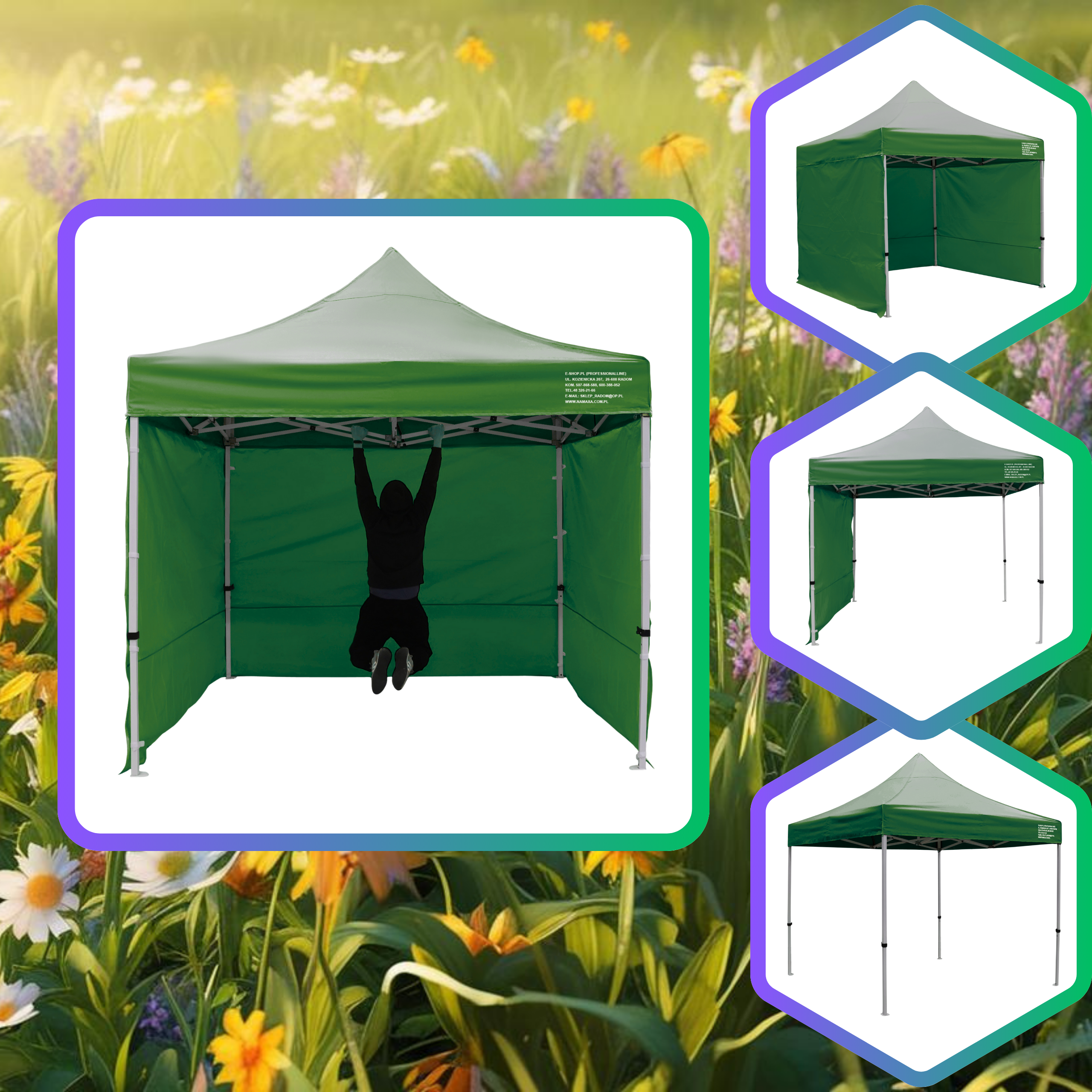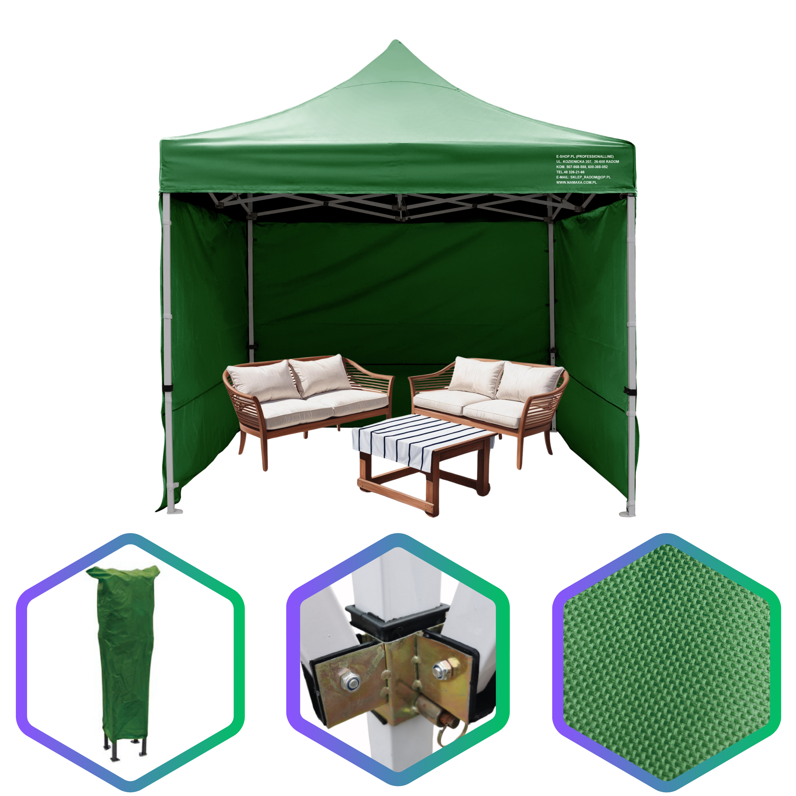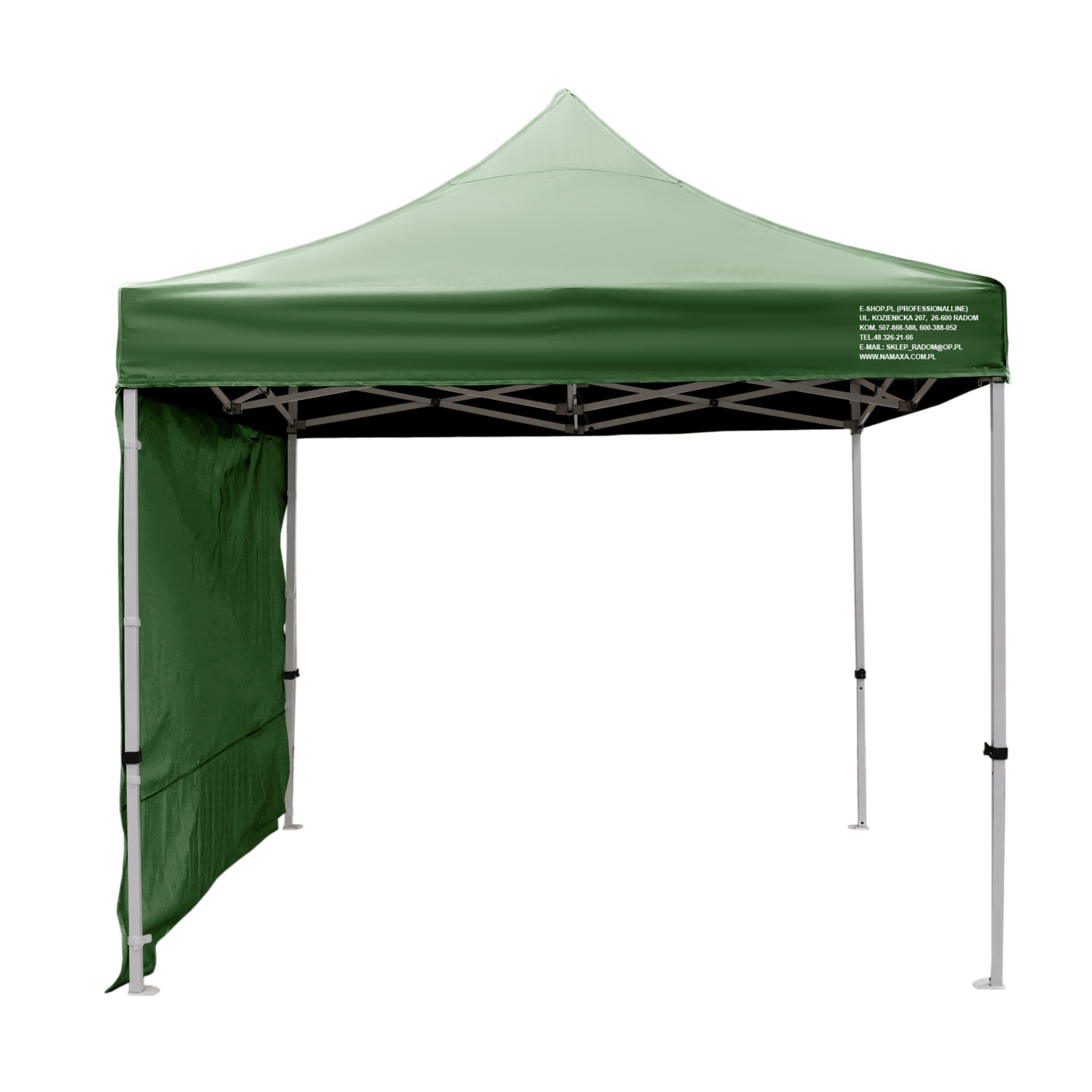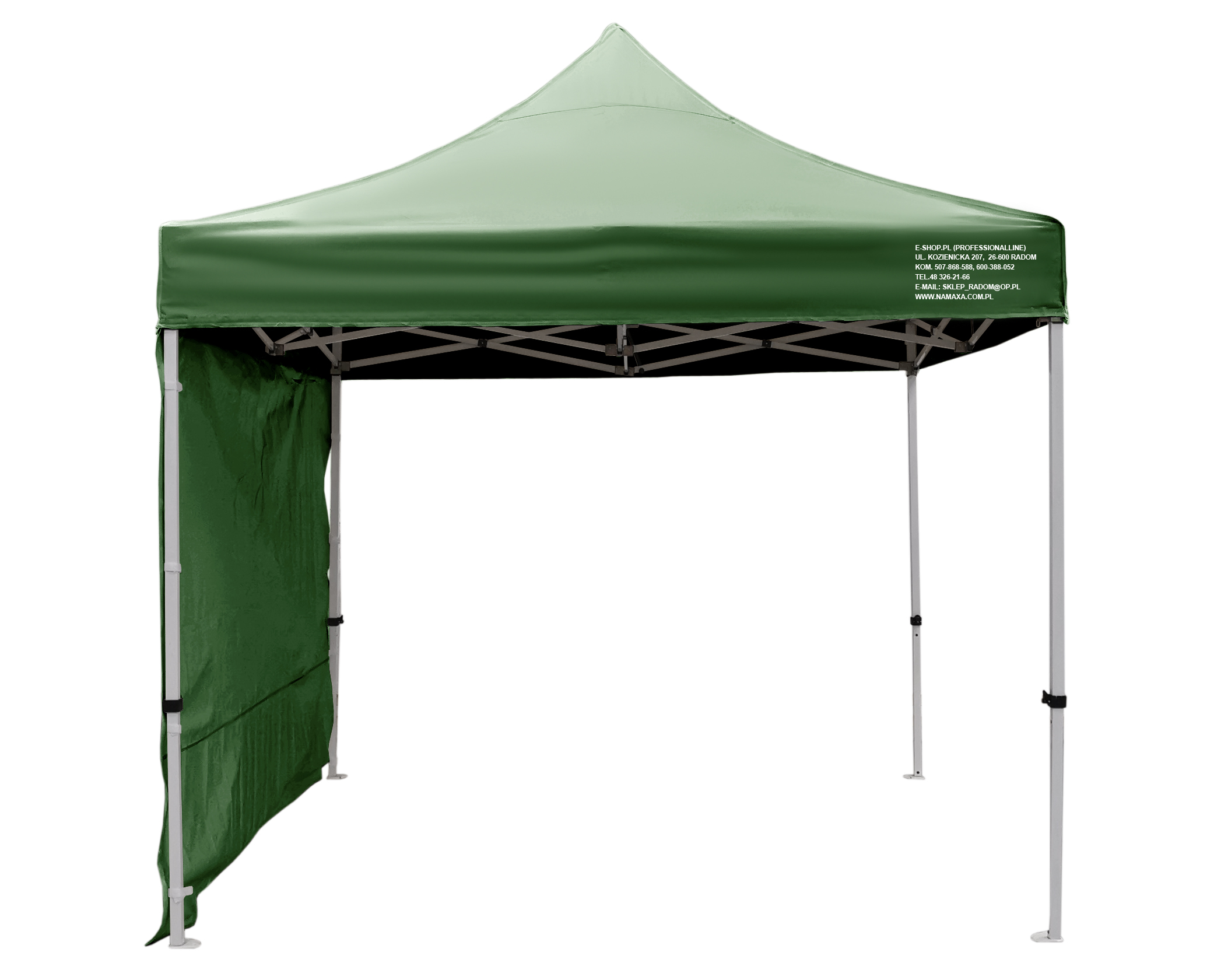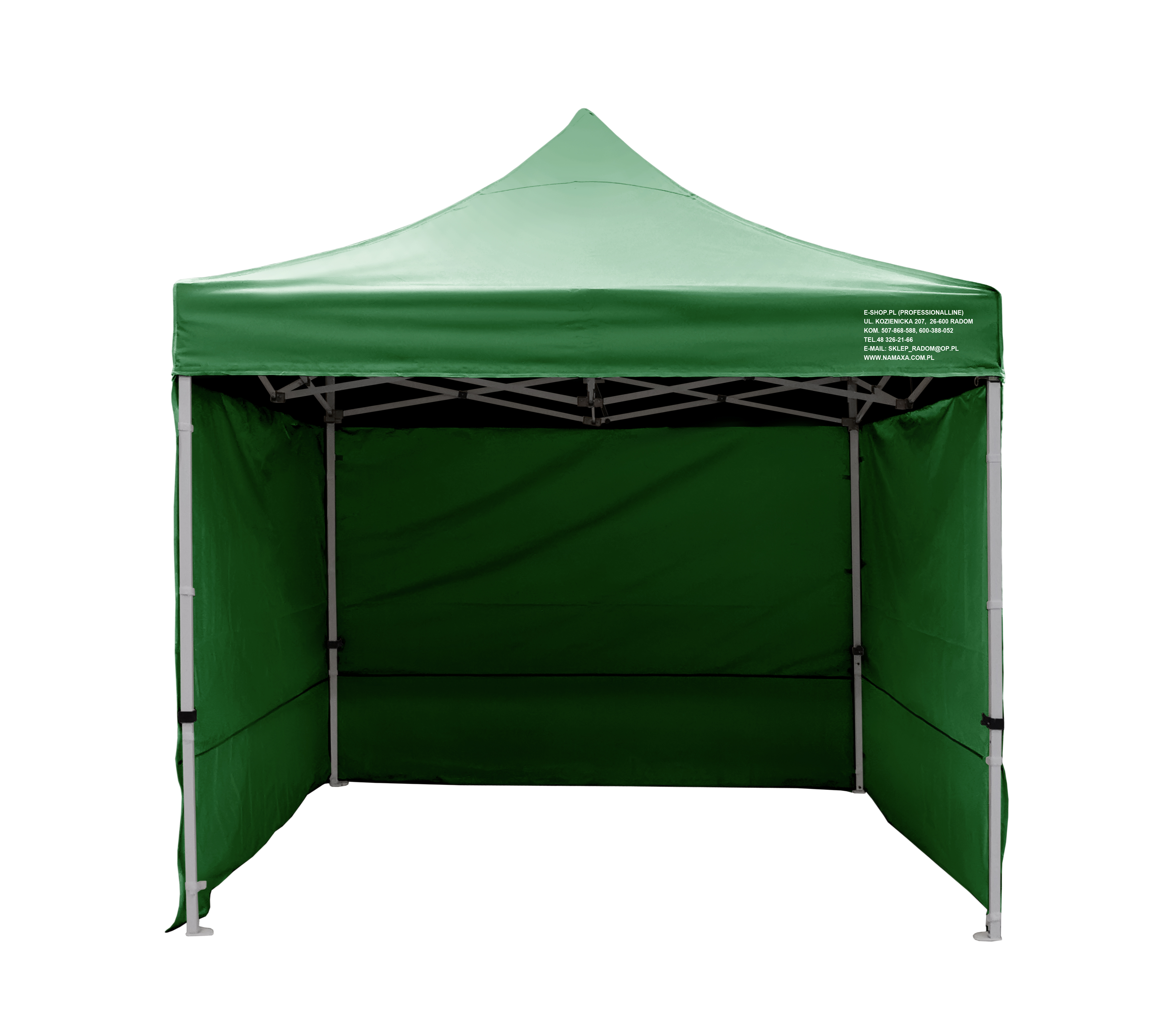 Uwaga: każdy namiot wyposażony jest w 3 ściany boczne; dodatkową ścianę można również domówić przy zakupie namiotu - półścianę; pełną lub z oknem.