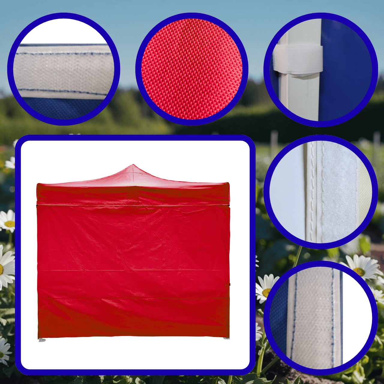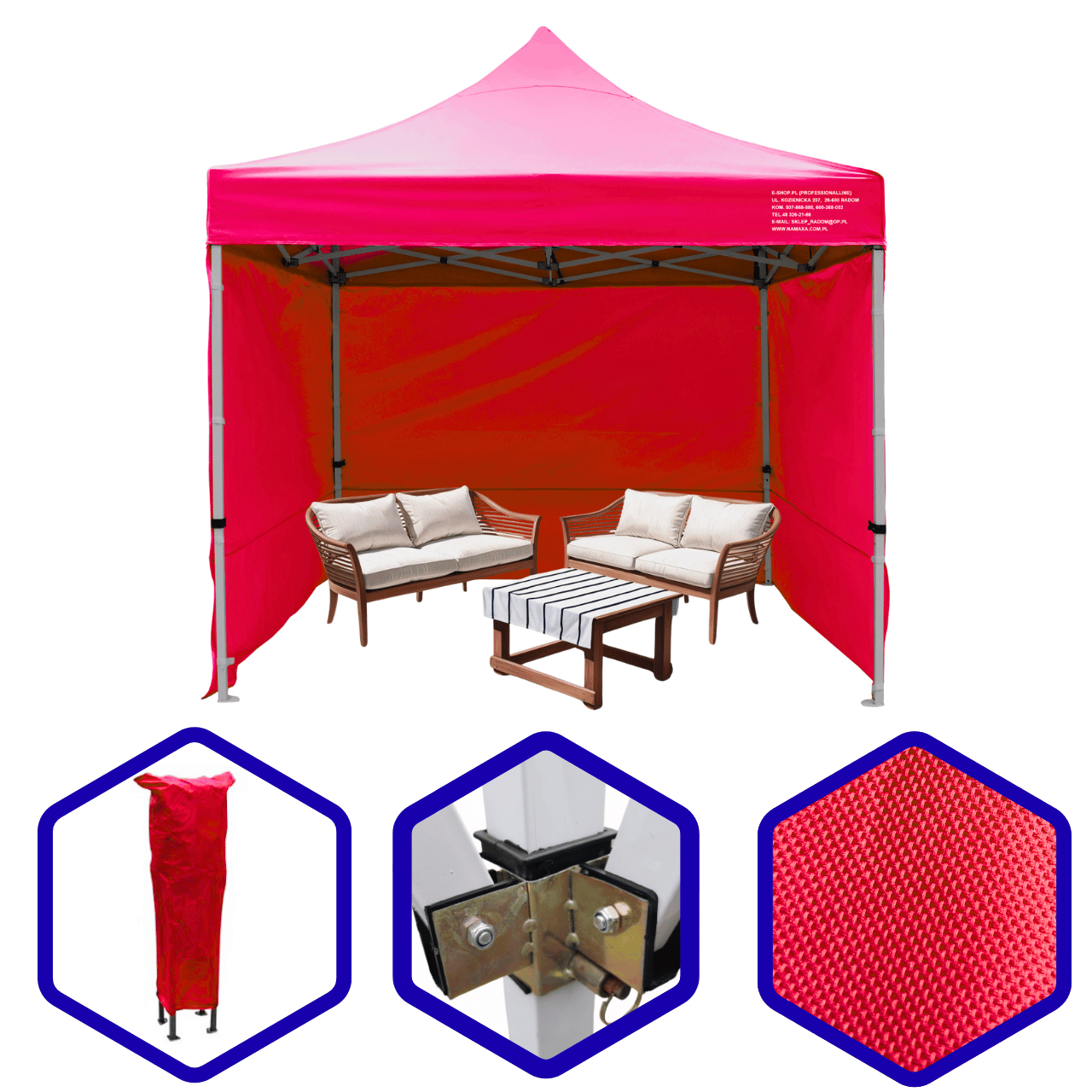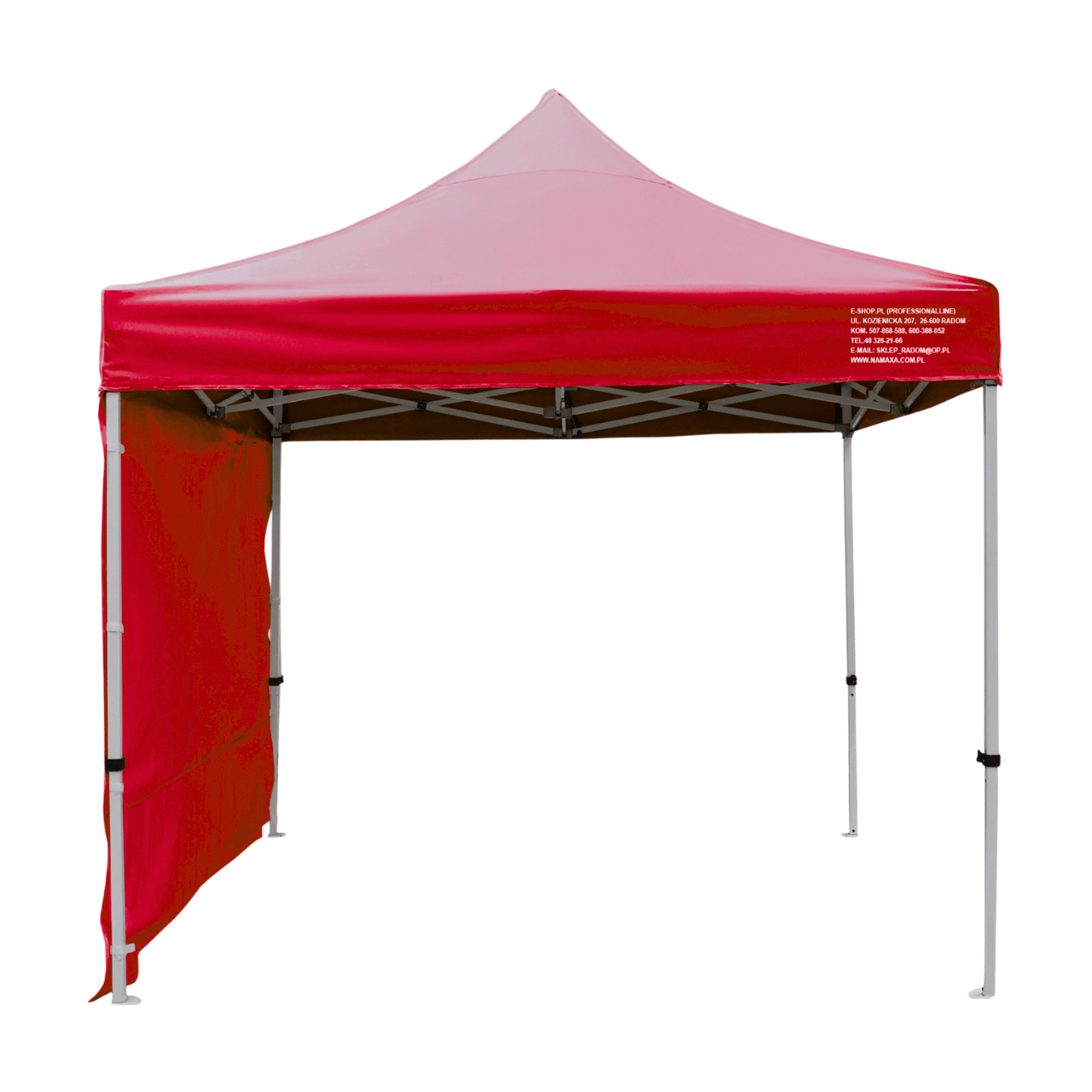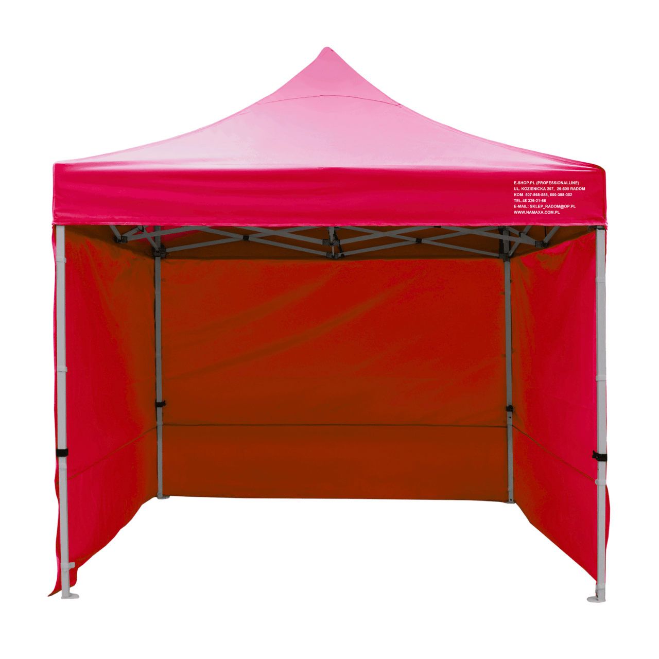 Uwaga: każdy namiot wyposażony jest w 3 ściany boczne; dodatkową ścianę można również domówić przy zakupie namiotu - półścianę; pełną lub z oknem.